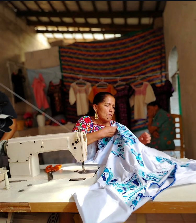 Dedicated to creating huipiles, dresses, sweaters, and garments for everyday beauty, their small workshop hums florals inspired by their natural surroundings blossom across cloth, echoing the landscapes of Puebla and the spirit of their Nahua roots. Each embroidered icon carries respect for origin, vibrating with symbolism and identity.