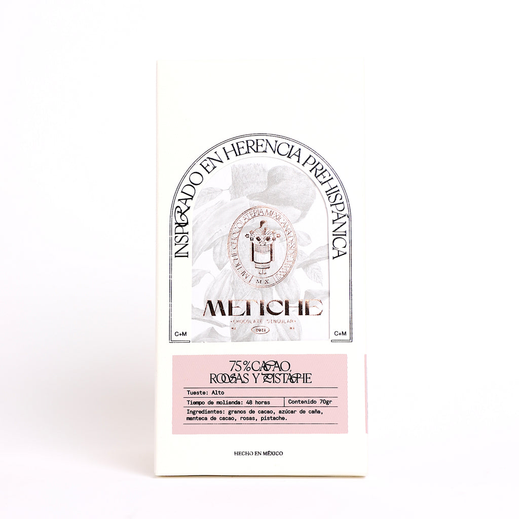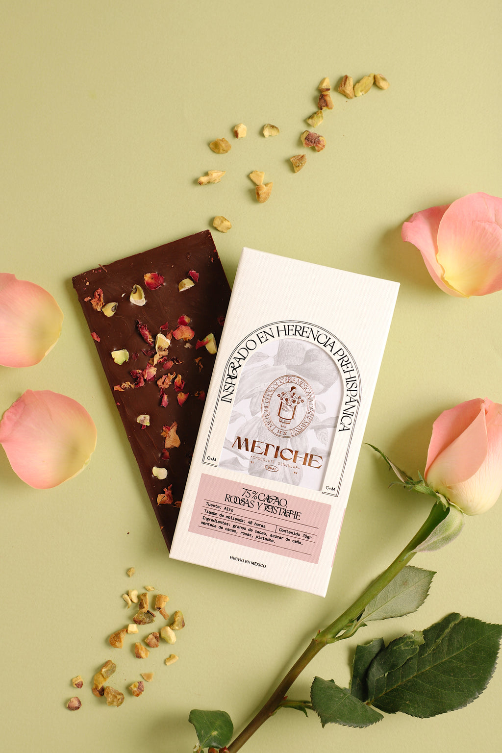 Dark Mexican Chocolate Bar, 75% Cacao, Rose Petals, and Pistachio